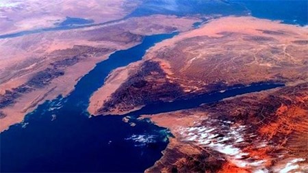 صورة من الفضاء للشمال السعودي المتضمن جزيرتي تيران وصنافير |